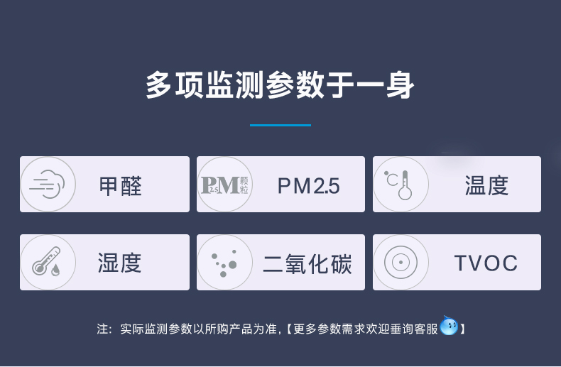 二氧化碳、温度、湿度、颗粒物、TVOC、甲醛、氨气、硫化氢、氧气、二氧化硫等,以实际所购版本为准。 |